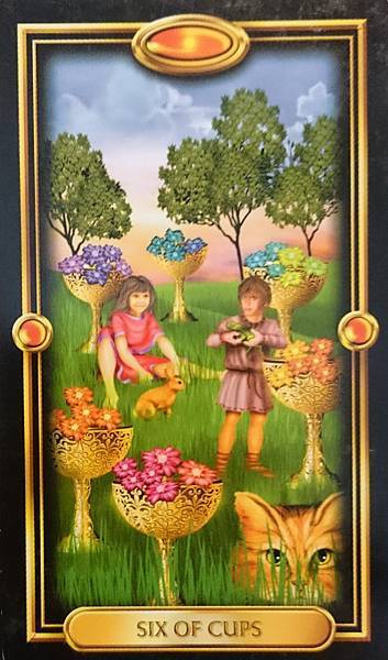 在傳統偉特的牌面中,聖杯六被塑造成一種安心而歡樂的氛圍,